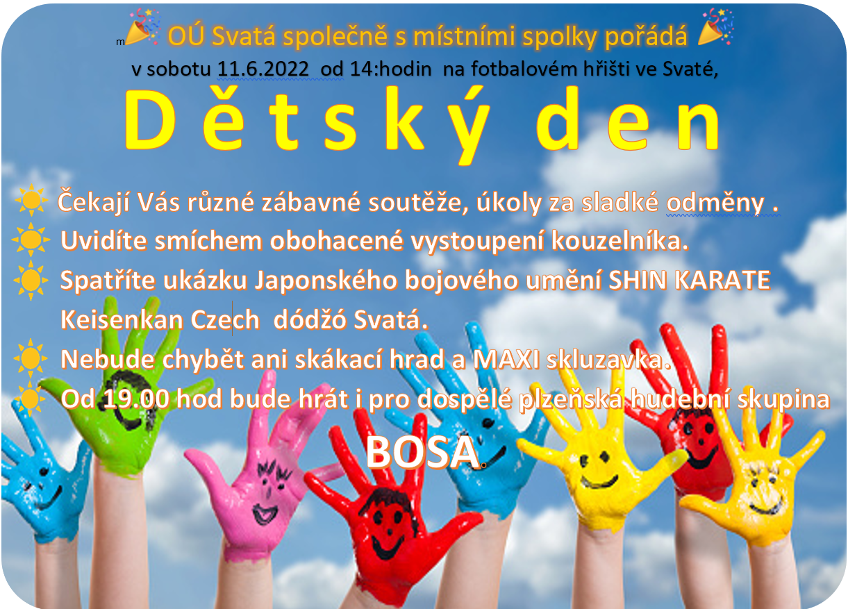 Vážení spoluobčané a hlavně děti. Srdečně Vás všechny zveme na Dětský den, který se koná v sobotu 11.6. od 14. hod. na místním fotbalovém hřišti.