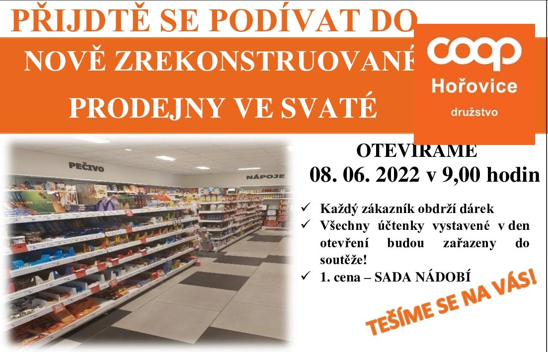 Otevření prodejny proběhne ve středu 8. 6. od 9h. Od 9. 6. běžná otevírací doba: Po-Pá 7-17h, So+Ne 7-14h